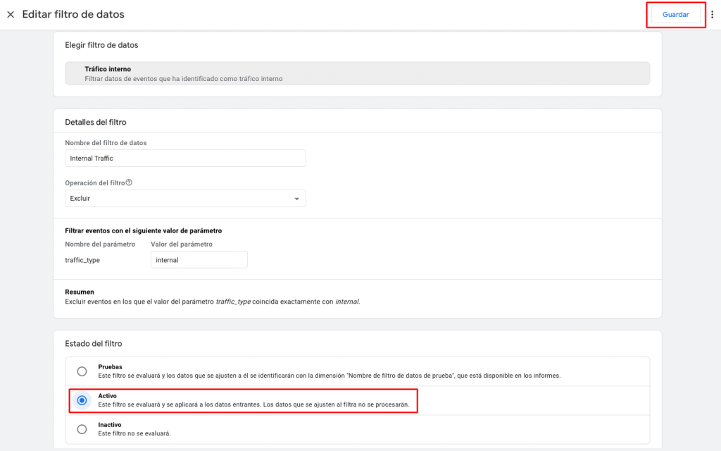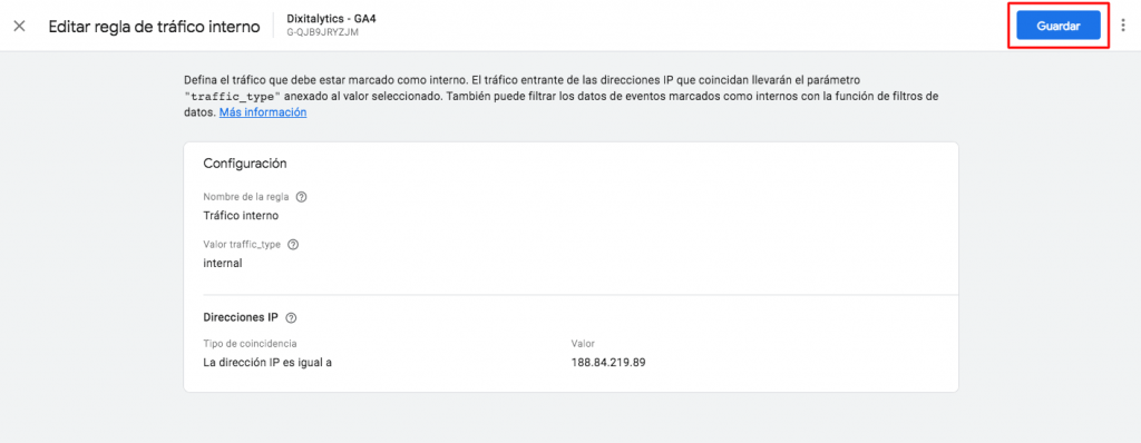 ✅ Una vez guardado ya hemos logrado nuestro objetivo, el tráfico interno no se recogerá en los informes de GA4.