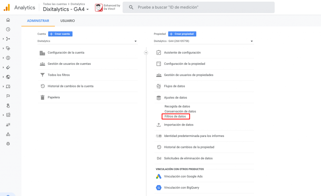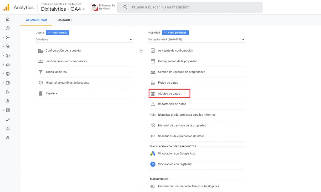 El último paso para lograr que el tráfico esté filtrado es activar el filtro de tráfico interno. Para ello volvemos al panel de administración de la propiedad y seleccionamos la opción ajustes de datos o data settings.