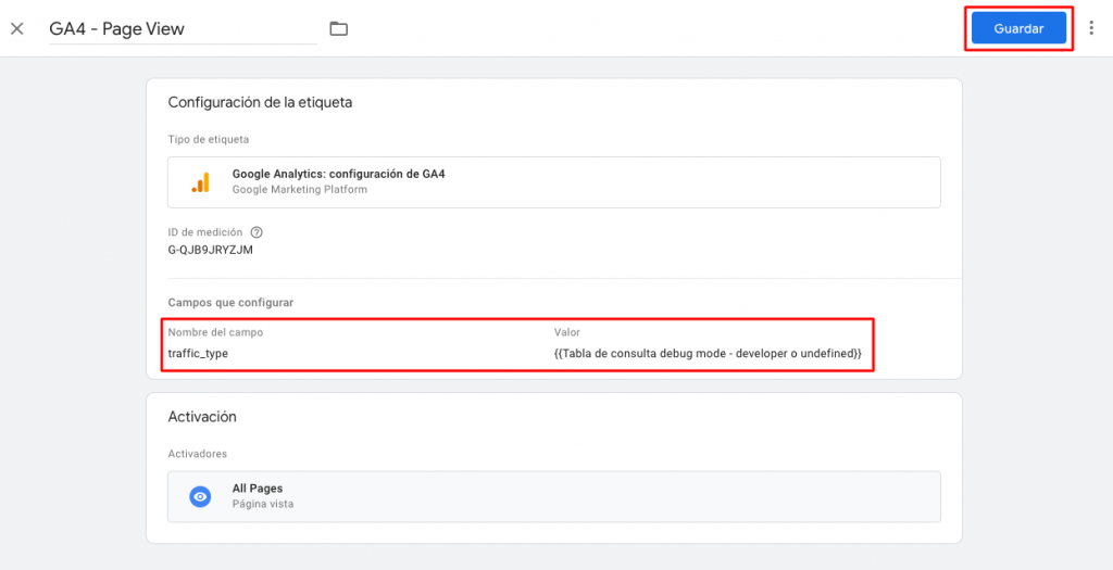 Dentro de campos a configurar debemos indicar en nombre del campo: traffic_type y en el valor del campo la variable {{Tabla de consulta debug mode – developer o undefined}}.