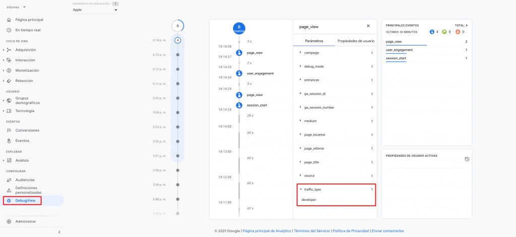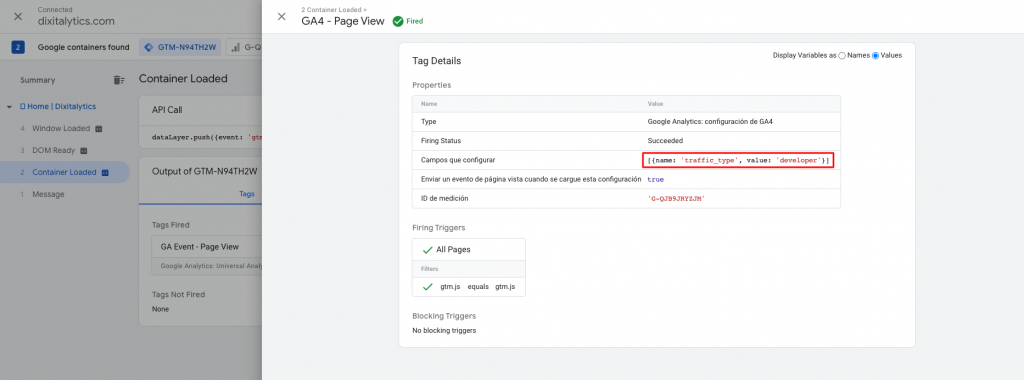 Dentro del evento page view la variable traffic_type debe ser igual a developer, eso significa que hemos realizado todos los pasos correctamente.