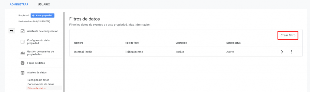 Para crear el filtro de desarrollador debemos ir en la configuración de la propiedad a los ajustes de datos, dentro de los ajustes seleccionamos filtros de datos. Al igual que hicimos con el filtro de tráfico interno, seleccionamos el botón crear filtro.