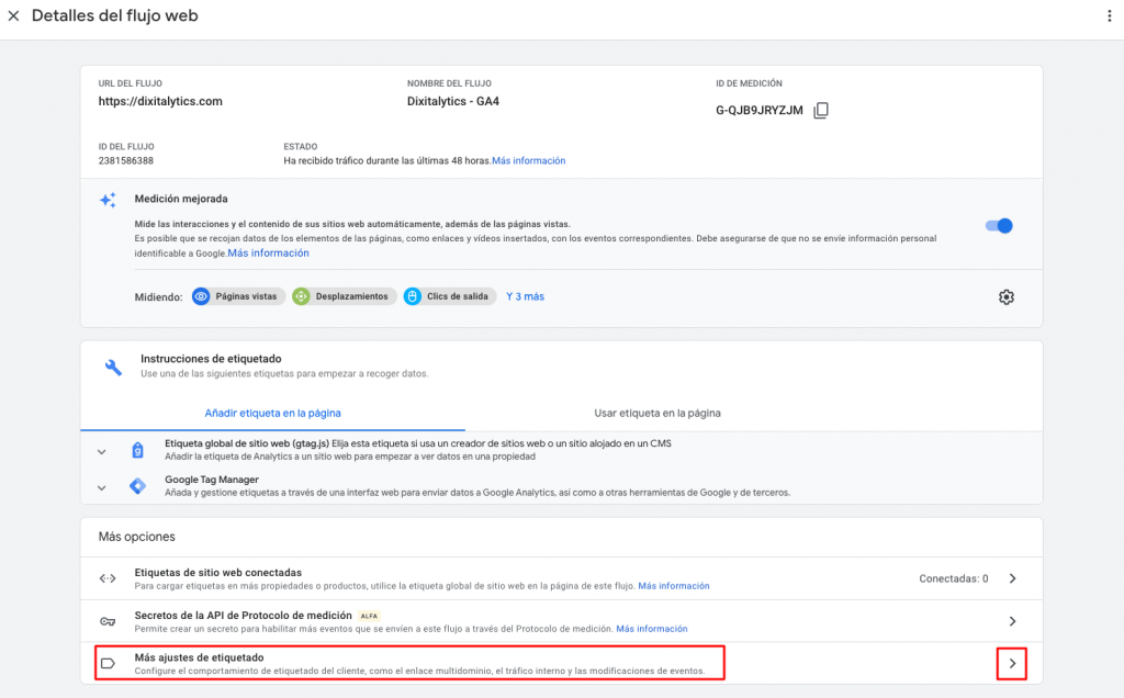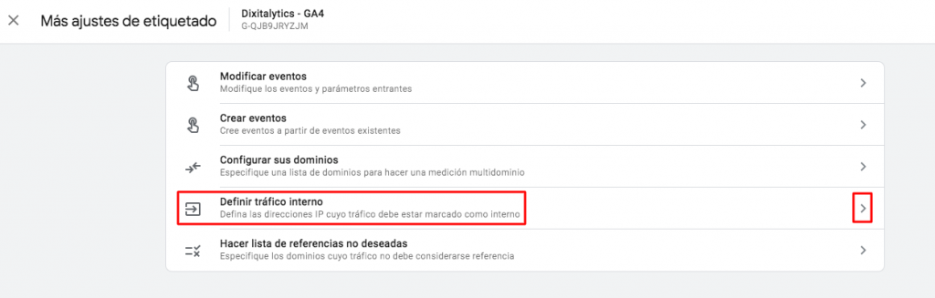 Actualización: Han cambiado de lugar la distribución de los elementos en GA4 desde que se ha escrito el artículo. Ahora el tráfico interno se define desde Flujos de datos > Configurar ajustes de etiquetas > Mostrar más > Definir tráfico interno.