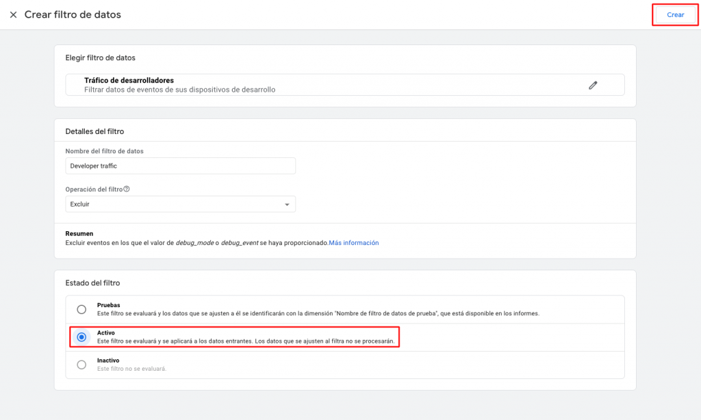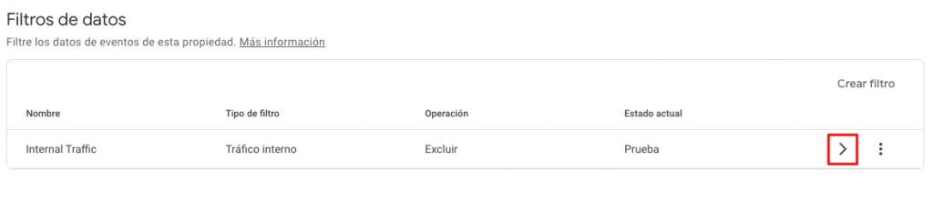 Por defecto en GA4 nos aparece este filtro de tráfico interno en modo Test o Pruebas, solamente tenemos que activarlo en las opciones de estado de filtro.
