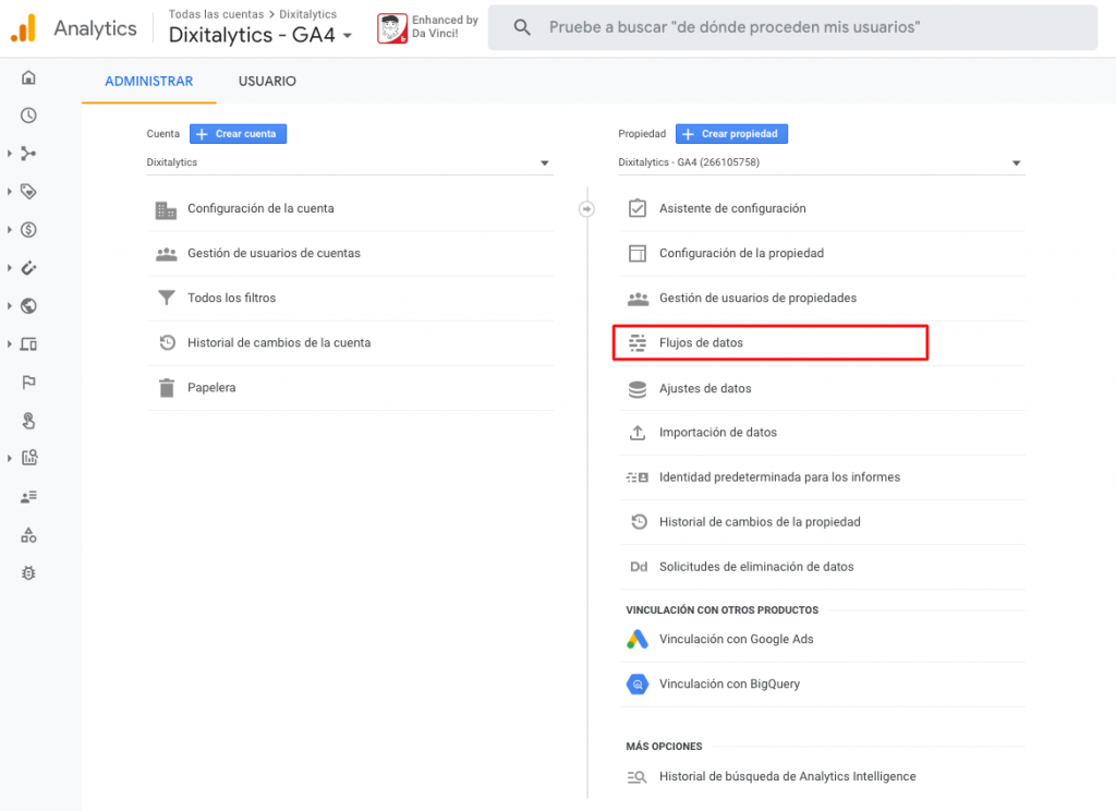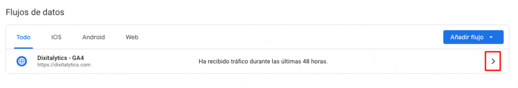 El primer paso que debemos llevar a cabo es definir el tráfico interno. Para ello debemos entrar en el panel de administración y a dentro de la propiedad hacer click en flujo de datos o data stream: