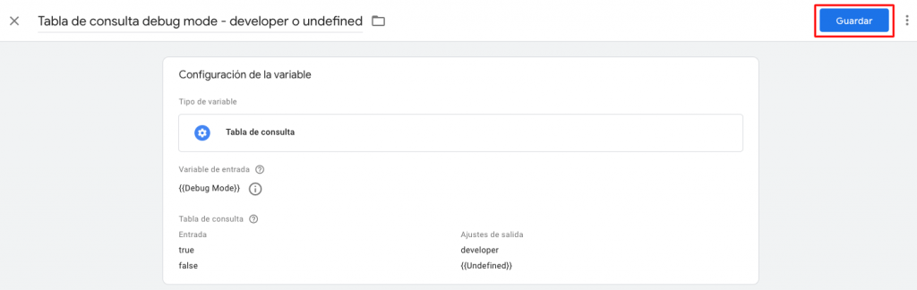 ⚠️ Con esta tabla de consulta conseguimos que cuando el modo debug esté funcionando se categorice el tráfico como developer (desarrollador). En caso de que no esté funcionando el tráfico se categoriza como undefined (indefinido).