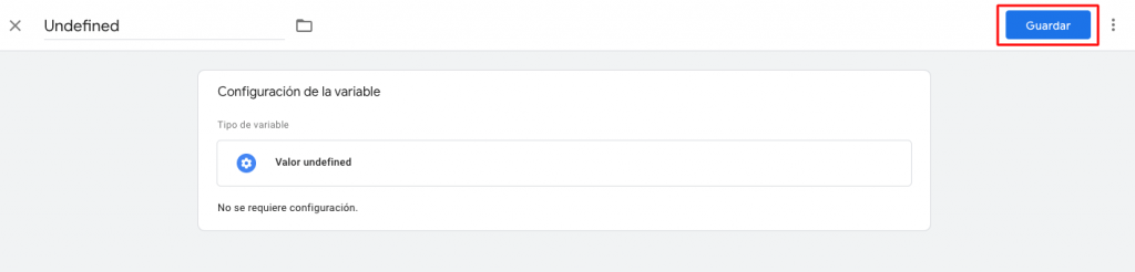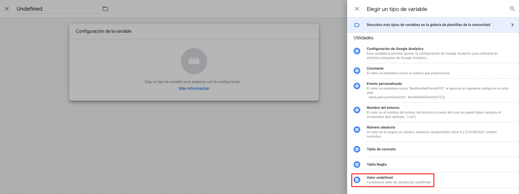 También debemos crear la variable undefined, para crear esta variable seleccionamos una nueva variable y elegimos el tipo de variable valor undefined o undefined value.